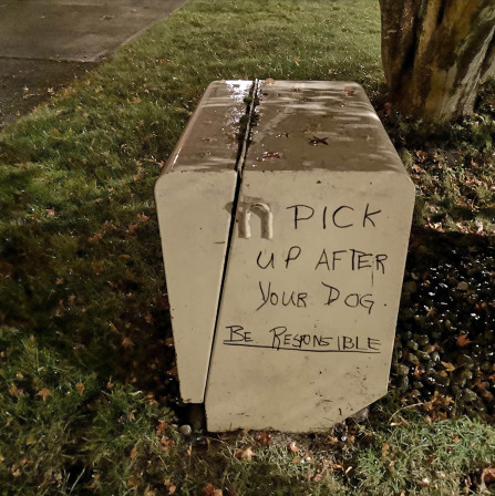 Those dog owners that do pick up their mutant's shit, send it to the landfill - instead of properly composting it - as mandated by David Suzuki - where it is a health hazard to workers and breaks down into methane, the main cause of global warming that is 86 times more destructive than CO2. Dog shit is also high in nitrogen and runs off into the watershed and consequently brooks, streams, rivers and oceans where it depletes the water of oxygen, killing marine life. How about picking up your pet's urine thank you very much.
